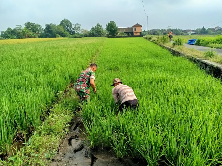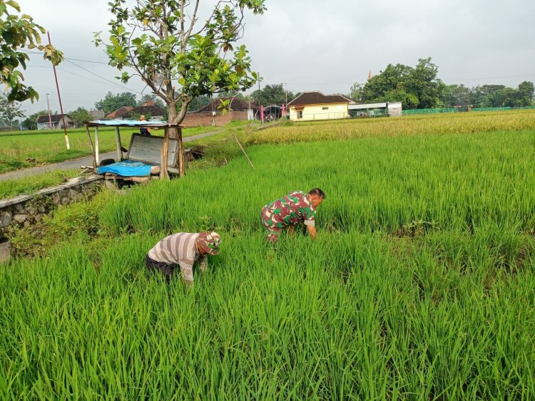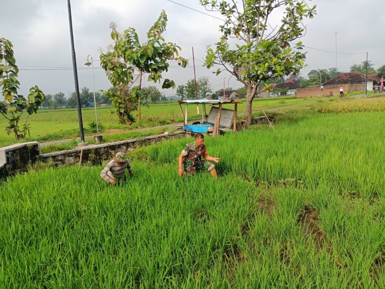 Babinsa Koramil Sawit turun ke sawah bantu petani bersihkan gulma padi secara manual demi mendukung ketahanan pangan di Boyolali.