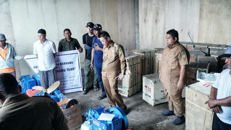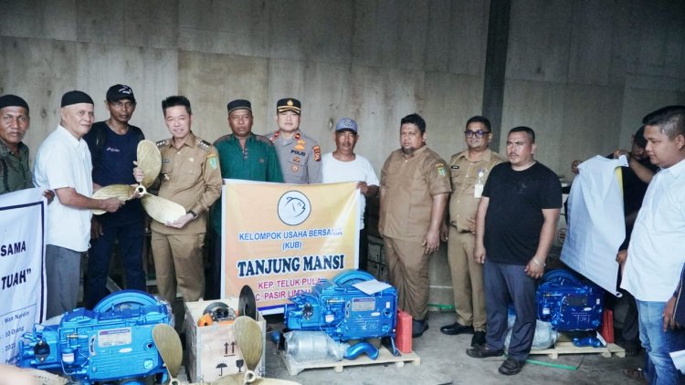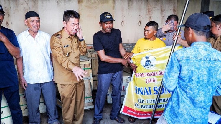 LINTASTIMURMEDIA.COM - ROHIL - Bupati Rokan Hilir Afrizal Sintong bersama Wakapolres Rohil Kompol Ricky Michael Mandey secara simbolis menyerahkan bantuan mesin boat sebanyak 80 buah mesin kepada kelompok nelayan yang ada di Kecamatan Bangko dan Palika, Selasa (19/9/2023) di pelabuhan ansui Bagansiapiapi.