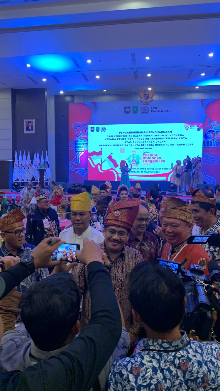 LINTASTIMURMEDIA.COM - Pekanbaru - 31 Agustus 2024 - Pemerintah Kota Pekanbaru akan menggelar acara bertajuk "Pesona Bhinneka Tunggal Ika" yang juga akan menjadi ajang Penganugerahan Penghargaan Gerakan Pembagian 10 Juta Bendera Merah Putih 2024 oleh Kementerian Dalam Negeri (Kemendagri) Republik Indonesia. Acara yang berlangsung pada Sabtu, 31 Agustus 2024 pukul 19.00 WIB di Ballroom Hotel Grand Central, Jalan Sudirman, Pekanbaru ini mengangkat tema "Dari Bumi Lancang Kuning untuk Nusantara" yang bertujuan untuk memperkuat semangat persatuan dan kesatuan bangsa.
