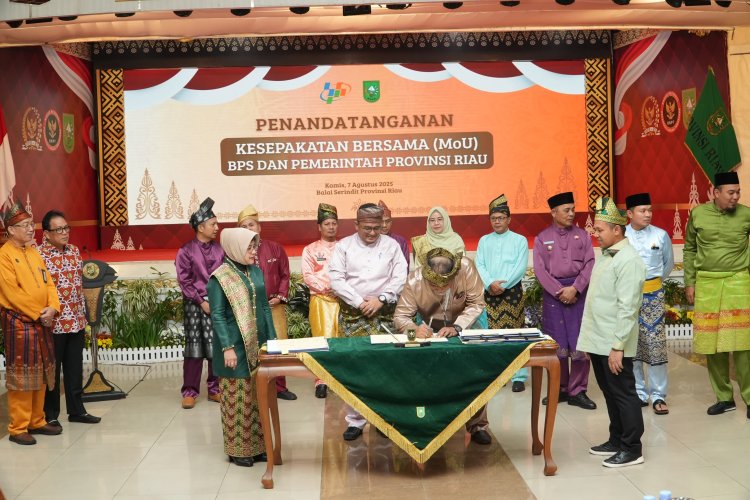 PEKANBARU, LINTASTIMURMEDIA.COM – Dalam rangka mewujudkan program Satu Data Indonesia, Pemerintah Provinsi Riau bersama seluruh Pemerintah Kabupaten/Kota se-Provinsi Riau resmi menandatangani Memorandum of Understanding (MoU) dengan Badan Pusat Statistik Republik Indonesia (BPS RI). Penandatanganan berlangsung di Balai Serindit, Aula Gubernuran Pekanbaru, Kamis malam (7/8/2025).