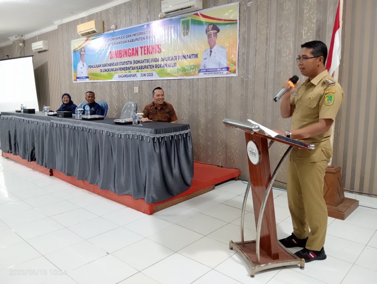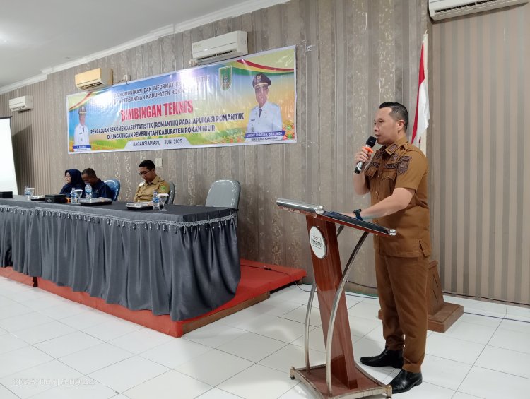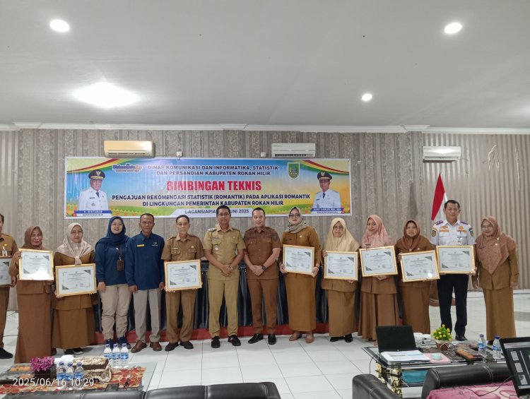 Pemkab Rokan Hilir melalui Diskominfotiks menggelar Bimtek Pengajuan Rekomendasi Statistik (Romantik) dan menyerahkan penghargaan kepada 10 OPD atas kontribusi data sektoral 2025, mendukung terwujudnya Satu Data Rokan Hilir.
