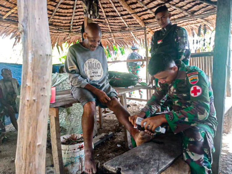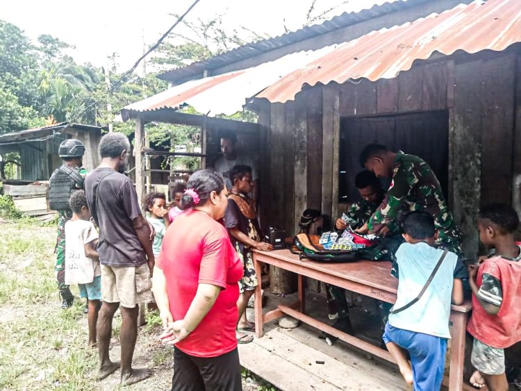 Satgas Yonif 122/TS Menggelar Pelayanan Kesehatan di Balai Kampung dan Mendatangi Rumah Warga