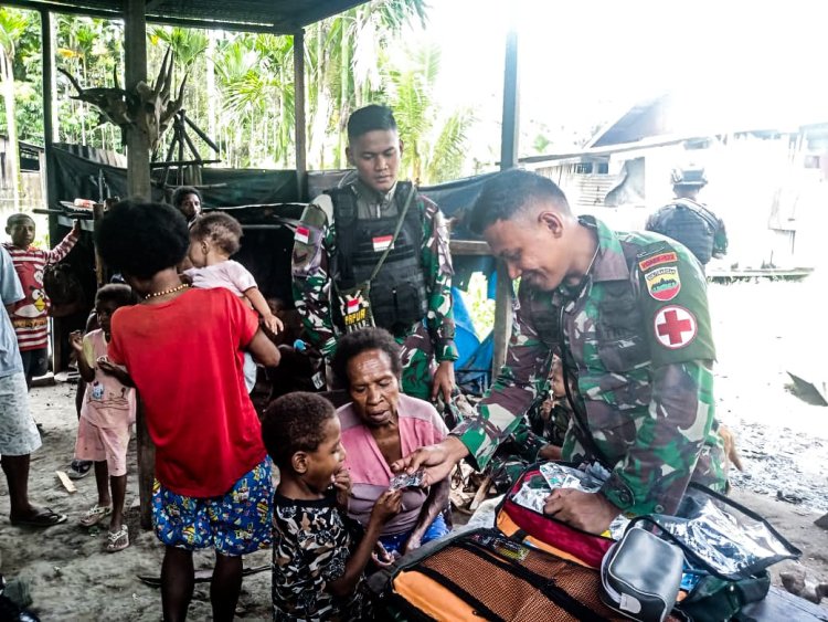 LINTASTIMURMEDIA.COM - Kabupaten Keerom - Berbagi kasih kebaikan adalah cara termudah untuk dicintai oleh sesama manusia maupun oleh Tuhan Yang Maha Esa, satgas Yonif 122 / Tombak Sakti melaksanakan pelayanan kesehatan kepada masyarakat Kampung Kalibom, Distrik Waris, Kabupaten Keerom, Papua, Rabu (20/12/2023).
