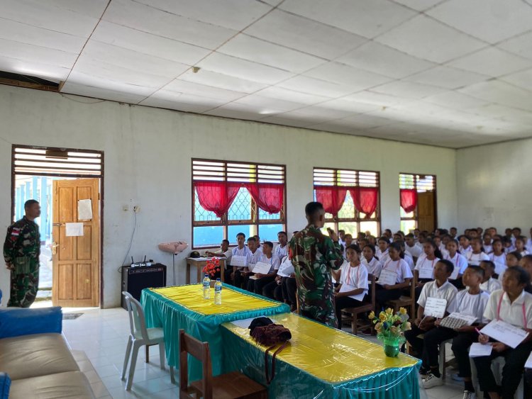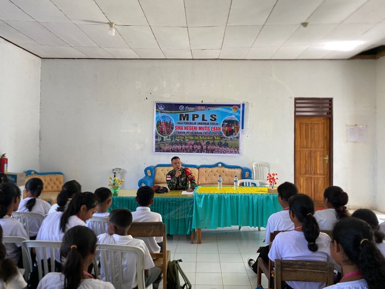 LINTASTIMURMEDIA.COM - Eban, NTT - Satgas Yonkav 6/Naga Karimata Beri Materi Wawasan Kebangsaan kepada Siswa SMA Baru. Dalam upaya berkontribusi terhadap pendidikan di perbatasan, Pakum Satgas Letda Chk M. Rizky Canka Lokananta memberikan materi Wawasan Kebangsaan (Wasbang) kepada siswa baru dalam rangka Masa Pengenalan Lingkungan Sekolah (MPLS) di SMA Mutis Eban, Desa Eban, Kecamatan Miomaffo Barat, Kabupaten TTU, Provinsi NTT pada Rabu (17/7/2024).