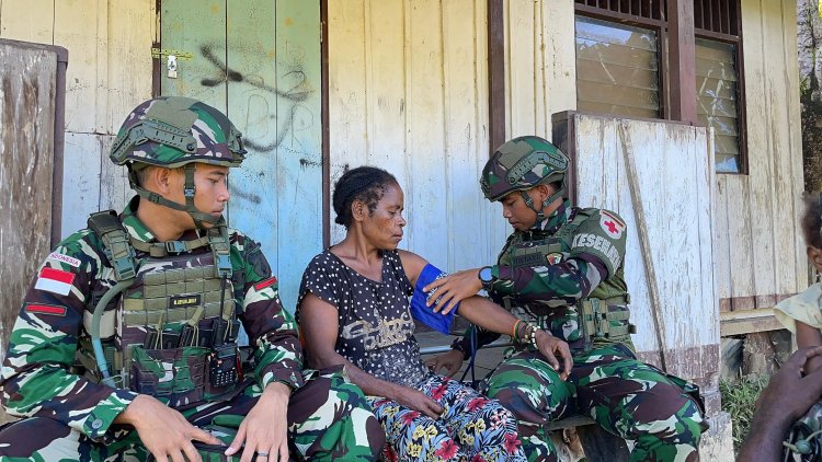 Satgas Yonif 521/DY TNI gelar pengobatan gratis door to door di Distrik Benawa, Papua Pegunungan, bantu tingkatkan kesehatan masyarakat perbatasan.